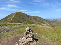 Route: taking a delayed 9:44am 77A bus over Whinlatter to Braithwaite and having a preliminary coffee at Jaspers. Then walking up through the village to the road and then track towards Barrow but keeping to the lower route to Barrow Door. Continuing under Causey Pike and rising to the pass, east of Sail. Ascending the rather gruelling zigzags to Sail’s summit before a small descent and ascent of Crag Hill. Spurning Eel Crag and its more difficult descent in favour of the gentle descent to an obvious path crossroads and turning right for Coledale Hause. Ascending 170m to the summit of Hopegill Head and bumping by chance into Mark Frost (owner of No3). Continuing to the summit of Whiteside and after a swig of wine, descending towards Dodd but turning right at the saddle just before it to follow minor paths to the new foot bridge and home via the familiar track to Scales.