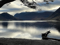 Thence round the lake and round the peel hillock (the “Horn”) and and across the obvious ‘other’ pebbly swimming beach to a muddy path at the start of the western edge of Crummock before turning sharp right uphill on a grassy path. Turning right on a lateral path below some trees, under Melbreak, and then ascending again round the northern ridge of the fell to the shortcut, right, to the stony track to the Kirkstile Inn. After a pint squeezed in by the fire, walking the 1km back along the road to the start.